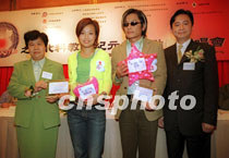 歌星容祖兒、王杰11日在香港出席「星火行動」之粵北科教新紀(jì)元助學(xué)演唱會記者會。演唱會將于5月26日晚上假廣東韶關(guān)舉行,主要籌募善款讓落后邊遠(yuǎn)山區(qū)的兒童受惠。廣東省韶關(guān)市市政府副市長楊春芳女仕(左)頒發(fā)委任狀予星火愛心大使容祖兒、王杰。中新社傳真 鄧慶樂 攝