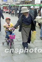西藏拉薩的一位藏族小朋友騎著小自行車(chē)上街,與母親傳統(tǒng)的藏裝相比,他的裝備無(wú)疑是現(xiàn)代了許多。中新社記者 滿會(huì)喬 攝