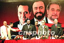 圖:三大男高音演唱會新聞發(fā)布會 2001年06月21日 18:46 ![]() 世界三大男高音北京紫禁城演唱會新聞發(fā)布會21日在北京舉行,先期到達北京的帕瓦羅蒂、卡雷拉斯和三大男高音的經(jīng)濟人魯?shù)浪沟瘸鱿⒒卮鹆酥型庥浾叩奶釂枴V行律缬浾?李剛 攝
