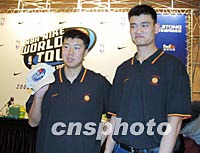 圖:王治郅、姚明將參加NBA星光大賽 2001年07月17日 21:40 ![]() 一場(chǎng)原汁原味的NBA比賽將于九月十六日首次在上海舉行。這場(chǎng)名為NBA NIKE星光大賽對(duì)賽的陣容是由NBA球星以及中國(guó)當(dāng)?shù)刈罴亚騿T混合組成。圖為王治郅、姚明在上海表示要盡力打好比賽。中新社記者 潘索菲 攝