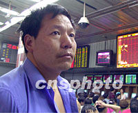 中國深滬股市周一的大幅下跌使北京證券市場(chǎng)的股民頗為吃驚。當(dāng)日深證成份指數(shù)以跌223.995點(diǎn)(-5.16%)報(bào)收,上證指數(shù)以跌108.91點(diǎn)(-5.27%)報(bào)收。七月以來,中國股民對(duì)國有股減持價(jià)格過高表示了一定的擔(dān)憂。中新社記者 鄒憲 攝