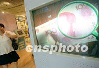 北京中國科技館里,電子超大屏幕顯示出一百元人民幣的放大圖樣,這是該館正在利用高科技手段向參觀者普及如何識別假人民幣的知識。中新社圖 張勤 攝
