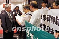 香港多個團體游行抗議日本首相參拜靖國神社 2001年08月16日 07:13 ![]() 香港多個團體15日舉行示威游行,抗議日本首相小泉純一郎參拜靖國神社。圖為香港教聯(lián)會向日本駐港總領事館遞交抗議信函。中新社圖 盧峰 攝