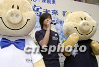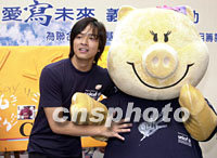 「齊心獻(xiàn)愛寫未來」義賣大行動將于18及19日在香港三十多個大型商場及地鐵站展開義賣行動,為「中國女童教育項(xiàng)目」籌募經(jīng)費(fèi),圖為陳曉東與義賣精品主角“豬扒家族”成員:豬扒(左)、碧琪(右)。中新社傳真 鄧慶樂 攝