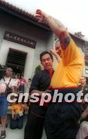 圖文:海外黃飛鴻門人到廣東佛山尋根拜祖 2001年08月28日 06:15 ![]() 南粵武林一代宗師黃飛鴻的一百多名海外弟子,27日在佛山黃飛鴻紀(jì)念館依照傳統(tǒng)武林習(xí)俗祭拜祖師黃飛鴻。他們是專程從美國、德國、瑞典等地來粵參加佛山黃飛鴻紀(jì)念館全面開業(yè)暨黃飛鴻一百四十五周年寶誕尋根拜祖等系列活動的。中新社記者 梁永強(qiáng) 攝 ![]() 27日,來自美國的黃飛鴻傳人、著名武術(shù)家余志偉在佛山黃飛鴻紀(jì)念館前為其洋弟子舉行隆重的入室弟子授腰帶儀式,以示對祖師的崇敬。中新社記者 梁永強(qiáng) 攝
