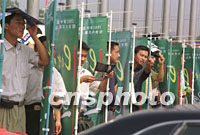 圖:西安市民頂烈日觀看貿(mào)洽會 2001年09月05日 18:35 ![]() 西安市民五日在烈日下靠廣告牌遮陽觀看貿(mào)易洽談會開幕式,等待進(jìn)入展廳。本屆展會上的現(xiàn)代化民用產(chǎn)品吸引了眾多參觀者。中新社記者 宋吉河 攝