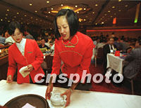 圖:為西部論壇客商服務(wù)小姐行唐代禮節(jié) 2001年09月05日 18:36 ![]() 西安唐樂宮的服務(wù)員五日以唐代禮節(jié)為參加西部論壇的賓客準(zhǔn)備茶水,會(huì)上近二百家國(guó)內(nèi)外企業(yè)的代表在此進(jìn)行了項(xiàng)目洽談。中新社記者 宋吉河 攝
