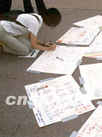圖:紐約華人以各種形式譴責(zé)恐怖主義 2001年09月19日 15:01 ![]() 紐約華埠孔子廣場平整的紅色地面上,近日貼著許多白色卡紙,上面用中英文寫著譴責(zé)恐怖活動;悼念“九一一”死難者;祈求世界和平;以及支持重建世貿(mào)中心大廈的字句和詩篇。圖為一位華裔女青年跪在地上寫下自己的心愿。中新社圖 龔文謨 攝 |