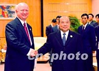 中國對外經濟貿易部石廣生部長十八日上午在上海國際會議中心與美國商務部副部長博德曼會談。中新社記者賈國榮攝