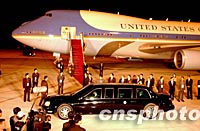 ![]() 美國(guó)總統(tǒng)布什乘坐空軍一號(hào)專機(jī)十八日黃昏飛抵上海浦東國(guó)際機(jī)場(chǎng),立即坐進(jìn)總統(tǒng)專車駛?cè)胧袇^(qū)。中新社記者 賈國(guó)榮 攝 |