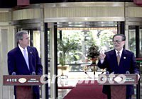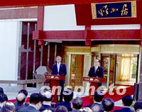 ![]() 十月十九日,美國總統(tǒng)布什在上海西郊賓館“睦如居”與中國國家主席江澤民會談,并共同在此舉行記者招待會!澳馈睘楹湍,“如”為如意。以此命名的江南風(fēng)格賓館,是外國元首下榻之地。中新社記者 賈國榮 攝