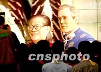 組圖:布什穿中式服裝亮相APEC峰會 2001年10月21日 11:31 ![]() 美國總統(tǒng)布什身穿藍色中式對襟服裝走出特制專用轎車,出席二十一日的上海APEC峰會。中外記者聚集在現(xiàn)場直播的電視屏幕前,進行同步報道。中新社記者 賈國榮 攝 ![]() 十月二十一日清晨,中外記者聚集在上海國際新聞中心現(xiàn)場直播的電視屏幕前,關(guān)注中國國家主席江澤民身著紅色中式對襟服,迎接身穿藍色中式對襟服的美國總統(tǒng)布什,進行出席上海APEC峰會。中新社記者 賈國榮 攝