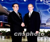 圖:江澤民迎接俄羅斯總統(tǒng) 2001年10月21日 11:32 ![]() 10月20日,中國國家主席江澤民在上海國際會議中心迎接俄羅斯總統(tǒng)普京。中新社圖 |