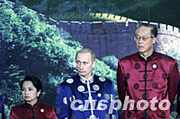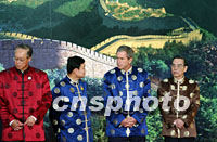 ![]() 美國總統(tǒng)布什身穿唐裝二十一日站在上?萍拣^中國萬里長(zhǎng)城圖案背景前,聆聽中國國家主席江澤民宣讀APEC《領(lǐng)導(dǎo)人宣言》。亞太經(jīng)合組織第九次領(lǐng)導(dǎo)人非正式會(huì)議二十一日在上海圓滿閉幕。中新社記者 王瑤 攝 ![]() 新加坡總理吳作棟、泰國總理他信、美國總統(tǒng)布什和越南總理潘文凱身穿唐裝21日站在上海科技館中國萬里長(zhǎng)城圖案背景前,聆聽中國國家主席江澤民宣讀APEC《領(lǐng)導(dǎo)人宣言》。亞太經(jīng)合組織第九次領(lǐng)導(dǎo)人非正式會(huì)議21日在上海圓滿閉幕。中新社記者 王瑤 攝