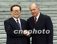 江澤民說,打擊恐怖主義是一項(xiàng)長(zhǎng)期艱巨任務(wù) 2001年10月23日 21:04 ![]() 國家主席江澤民二十三日在北京歡迎來訪的智利總統(tǒng)拉戈斯。中新社記者 滿會(huì)喬 攝