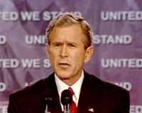 布什發(fā)表演講 呼吁美國(guó)民眾恢復(fù)正常生活 2001年11月09日 18:31 ![]() 布什8日在亞特蘭大發(fā)表全國(guó)講話(huà)說(shuō),一個(gè)四歲的小女孩曾寫(xiě)信問(wèn)他:"那些人都不知道我們是誰(shuí)就攻擊我們。我們干嘛不告訴他們我們叫什么呢?"布什接著說(shuō):"我們會(huì)告訴那些恐怖分子我們是誰(shuí)的,我們會(huì)告訴他們美國(guó)是誰(shuí)。"布什的講話(huà)引來(lái)在場(chǎng)五千名聽(tīng)眾起立鼓掌。
