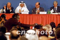 組圖:第四屆WTO部長會議審議通過中國入世 2001年11月11日 00:31 ![]() 第四屆WTO部長會議十日在卡塔爾首都多哈舉行會議正式通過中國入世。圖為世貿(mào)組織第四屆WTO部長會議組委會主席、卡塔爾財政經(jīng)貿(mào)大臣尤素夫·候賽因·卡馬爾敲錘通過中國加入世貿(mào)組織。中新社記者 錢興強 攝 ![]() 第四屆WTO部長會議十日晚在卡塔爾首都多哈舉行會議正式通過中國入世。圖為會議主席臺。中新社記者 錢興強 攝