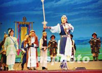 圖:金庸小說《射雕英雄傳》搬上京劇舞臺(tái) 2001年12月11日 17:27 ![]() 武漢市京劇團(tuán)根據(jù)金庸的武俠小說《射雕英雄傳》改編而成的同名京劇,十二月十日晚在南京大行宮會(huì)堂成功上演,成為第三屆中國(guó)京劇節(jié)唯一的一臺(tái)武俠劇。原著中描寫高深莫測(cè)的武功借助京劇中的“出手”及現(xiàn)代特技,得到了較好表現(xiàn)。中新社圖 劉小楚 攝 |