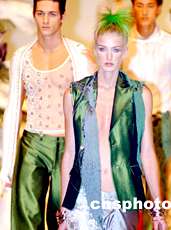 ![]() 香港時(shí)裝節(jié)展示前衛(wèi)男女冬裝。“香港時(shí)裝節(jié)2002秋冬系列”的“冬日傳奇”時(shí)裝展示1月15日在香港會(huì)展中心舉行,模特在“冰天雪地”中展示香港設(shè)計(jì)師最新設(shè)計(jì)的男女前衛(wèi)冬裝。中新社傳真 任晨鳴 攝 ![]() 香港時(shí)裝節(jié)展示黑紅相佩女冬裝!跋愀蹠r(shí)裝節(jié)2002秋冬系列”的“冬日傳奇”時(shí)裝展示1月15日在香港會(huì)展中心舉行,模特在“冰天雪地”中展示香港設(shè)計(jì)師最新設(shè)計(jì)的黑紅相佩的女冬裝。中新社傳真 任晨鳴 攝