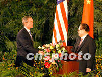 圖文:中美兩國(guó)元首會(huì)談后共同會(huì)見(jiàn)記者回答提問(wèn) 2002年02月21日 13:15 ![]() 國(guó)家主席江澤民與美國(guó)總統(tǒng)布什二十一日在北京共同會(huì)見(jiàn)中外記者,這是繼APEC上海峰會(huì)以來(lái)兩國(guó)元首第二次共同會(huì)見(jiàn)記者。中新社記者 滿會(huì)喬 攝 ![]() 中國(guó)國(guó)家主席江澤民二十一日在北京迎接美國(guó)總統(tǒng)布什登臺(tái),出席共同會(huì)見(jiàn)記者的電視直播。中新社記者 賈國(guó)榮 攝
