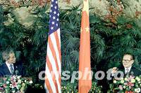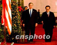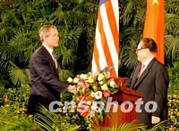 ![]() 中國(guó)國(guó)家主席江澤民請(qǐng)美國(guó)總統(tǒng)布什登上北京的紅地毯,共同出席二十一日中午會(huì)見記者的電視直播。中新社記者 賈國(guó)榮 攝