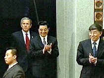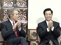 圖:胡錦濤陪同布什總統(tǒng)進(jìn)入清華會場 2002年02月22日 10:55 ![]() ![]()