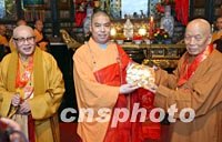 圖:兩岸佛教人士互贈(zèng)送禮品 2002年02月22日 13:56 ![]() 在西安參加法門寺佛指舍利赴臺(tái)灣地區(qū)瞻禮(供奉)活動(dòng)的兩岸佛教人士,二十二日上午來(lái)到西安大慈恩寺參觀,該寺方丈增勒法師向臺(tái)灣佛教人士贈(zèng)送禮品。中新社記者 錢興強(qiáng) 攝