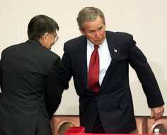 幽默和尷尬——外電報(bào)道布什訪華過程花絮(圖) 2002年02月22日 17:08 ![]() 清華校長王大中扶住差點(diǎn)絆倒的布什(美聯(lián)社) 中新網(wǎng)北京2月22日消息:布什對中國的訪問在坦誠和熱情的氣氛中進(jìn)行,兩國領(lǐng)導(dǎo)人就中美關(guān)系和國際形勢等重大問題進(jìn)行了重要的會(huì)談,而訪問過程中也出現(xiàn)了一些有趣的花絮。 布什遇上兩次小麻煩 據(jù)德新社報(bào)道,今天布什座車的輪胎在赴宴途中爆裂,迫使他換乘后面的車輛。當(dāng)時(shí)他剛結(jié)束在清華大學(xué)的演講,正趕往北京市中心的中南海與江澤民主席共進(jìn)午餐。布什被迫放棄自己的豪華轎車,但是沒有延誤他與江主席的會(huì)晤。爆胎是美國總統(tǒng)今天遇上的第二次尷尬。 此前,布什在清華大學(xué)的演講贏得了兩三百名學(xué)生的熱烈掌聲,但是提問環(huán)節(jié)結(jié)束后,他在走過講臺準(zhǔn)備與中國官員握手時(shí)腳底絆了一下。布什顯然試圖化解這一尷尬場面,順勢做了要與一名中國官員擁抱的樣子。 清華演講不乏幽默 美國的《紐約時(shí)報(bào)》的報(bào)道說,布什在中國高等學(xué)府清華大學(xué)的演說時(shí)有幽默之處。在提問環(huán)節(jié),布什的中文譯員最開始居然準(zhǔn)備把總統(tǒng)的回答翻譯成她自己“出色”的英語。布什笑著說:“她在糾正我的英語! 還有一次,一名學(xué)生問布什是否鼓勵(lì)自己的雙胞胎女兒來中國學(xué)習(xí)。布什再次笑答:“恐怕她們不再聽我的話啦,如果你明白我的意思的話!
