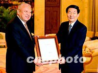 ![]() 中國總理朱镕基七日在北京人民大會堂香港廳,向董建華先生頒發(fā)連任香港特別行政區(qū)第二任行政長官的任命書。中新社記者 賈國榮 攝