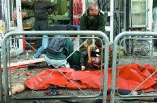 耶路撒冷發(fā)生自殺炸彈襲擊 至少兩人死亡(圖) 2002年03月21日 23:29 ![]() 一名傷者在死者遺體邊接受急救 中新網(wǎng)北京3月21日消息:耶路撒冷市中心今天發(fā)生自殺性炸彈襲擊,造成至少兩人死亡,另有四十人受傷。此事對美國推動中東和平進程的努力無疑又構成沉重打擊。 當?shù)鼐秸f,事件發(fā)生在當?shù)貢r間21日下午4時25分左右。出事地點靠近最近發(fā)生的多起槍擊與炸彈襲擊地區(qū)。 目擊者說,多輛救傷車在事發(fā)后趕到現(xiàn)場并載走許多傷者,警方已封鎖現(xiàn)場,方便進行救人的工作。 據(jù)以色列電臺報道,初步報告指出,有7名傷者的傷勢相當嚴重。