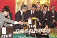 組圖:澳門博彩股份有限公司正式接手11間賭場 2002年04月02日 16:14 ![]() 澳門博彩股份有限公司一日凌晨正式接手經(jīng)營澳門旅游娛樂有限公司屬下的十一間賭場,新的博彩合約正式生效。圖為兩家公司于零點時分在賭場交接。中新社記者 宗金柱 攝