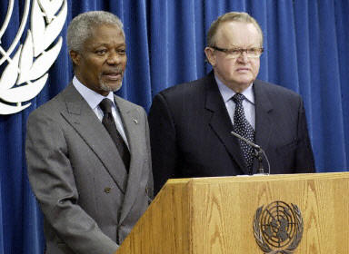 聯(lián)合國(guó)秘書(shū)長(zhǎng)安南任命杰寧難民營(yíng)真相調(diào)查團(tuán)(圖) 2002年04月23日 09:47 聯(lián)合國(guó)秘書(shū)長(zhǎng)安南與芬蘭前總統(tǒng)阿赫蒂薩里在新聞發(fā)布會(huì)上。(法新圖) 中新網(wǎng)北京4月23日消息:聯(lián)合國(guó)秘書(shū)長(zhǎng)安南星期一說(shuō),芬蘭前總統(tǒng)阿赫蒂薩里將率領(lǐng)調(diào)查團(tuán),前往西岸巴勒斯坦城市杰寧的難民營(yíng)。 據(jù)德新社報(bào)道,安南表示這是根據(jù)聯(lián)合國(guó)安理會(huì)的決議作出的決定。安理會(huì)上周對(duì)美國(guó)的提議進(jìn)行表決,決定向杰寧難民營(yíng)派出調(diào)查團(tuán),調(diào)查有關(guān)以色列制造屠殺的指控。 聯(lián)合國(guó)前難民事務(wù)專(zhuān)員日本人緒方貞子和國(guó)際紅十字會(huì)前主席瑞士人索馬魯加都將參加這個(gè)調(diào)查團(tuán),退役的美國(guó)將軍威廉·納什和曾經(jīng)領(lǐng)導(dǎo)過(guò)駐波斯尼亞聯(lián)合國(guó)警察部隊(duì)的愛(ài)爾蘭人菲茨杰拉德將擔(dān)任調(diào)查小組的軍事顧問(wèn)。 安南表示:“這個(gè)小組的成員都是經(jīng)驗(yàn)豐富,具有較高水準(zhǔn)的專(zhuān)業(yè)人士。我需要有一個(gè)具有獨(dú)立意志的調(diào)查小組。”