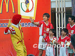 ![]() 麥當(dāng)勞日前在上海南京路世紀(jì)廣場舉行“體驗世足魅力,盡在麥當(dāng)勞”系列活動。圖為“麥當(dāng)勞叔叔”和以影星周星馳為首的小足球隊員在一起“比賽”。錢興強 攝