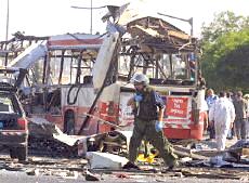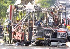 耶路撒冷市中心公共汽車爆炸案已有18人死亡(圖) 2002年06月18日 15:29 ![]() ![]() 被襲擊的公共汽車 中新網(wǎng)北京6月18日消息:以色列電視二臺18日報道說,耶路撒冷市中心當(dāng)日上午發(fā)生公共汽車自殺炸彈襲擊事件,造成17人死亡。 報道沒有說明死亡人數(shù)中是否包括自殺炸彈襲擊者本人。這起自殺性炸彈襲擊還造成車上32人受傷。 這輛公共汽車從耶路撒冷南郊的吉羅猶太人區(qū)開往市中心,當(dāng)時正是交通高峰時段。 阿克薩烈士旅宣稱對耶路撒冷公汽爆炸案負責(zé) 中新網(wǎng)北京6月18日消息:黎巴嫩真主黨游擊隊的電視臺18日接到匿名電話,此人聲稱“阿克薩烈士旅”對耶路撒冷爆炸案負責(zé)。 德新社援引該電視臺的報道說,這次炸彈襲擊是為了“阿克薩烈士旅”在伯利恒的領(lǐng)導(dǎo)人蘇布赫17日被殺而進行的報復(fù)。 耶路撒冷南部18日交通高峰時段發(fā)生公共汽車爆炸案,造成13人死亡,40人受傷,其中5人情況危急。 哈馬斯組織也聲稱對耶路撒冷公汽爆炸案負責(zé) 中新網(wǎng)北京6月18日消息:巴勒斯坦激進的“伊斯蘭抵抗運動”(哈馬斯組織)18日宣稱對耶路撒冷公共汽車爆炸案負責(zé)。 有人給法新社打去匿名電話,聲稱哈馬斯組織的軍事派別“卡薩姆旅”實施了這次行動。 另據(jù)報道,黎巴嫩真主黨游擊隊的電視臺也接到匿名電話,此人聲稱“阿克薩烈士旅”對耶路撒冷爆炸案負責(zé)。 耶路撒冷市中心18日交通高峰時段發(fā)生公共汽車爆炸案,造成17人死亡,約30人受傷。 沙龍親臨耶路撒冷爆炸現(xiàn)場拒談巴勒斯坦建國 中新網(wǎng)北京6月18日消息:在耶路撒冷市中心發(fā)生造成17人死亡的公汽爆炸案后,以色列總理沙龍18日拒絕巴勒斯坦建國。 據(jù)法新社報道,沙龍在事發(fā)現(xiàn)場對記者表示:“你還能談什么巴勒斯坦國家。”這是沙龍出任總理以來首次親往巴勒斯坦人自殺炸彈襲擊現(xiàn)場視察。 沙龍在數(shù)十名警察和保鏢的簇擁下表示:“我們今天見到的是巴勒斯坦恐怖主義,我們必須打擊這種恐怖主義,這也正是我們在做的! 美國官員最近提出建立臨時的巴勒斯坦國家的構(gòu)想,并通過談判確定其最終的形式。 18日的自殺性炸彈襲擊發(fā)生之際,美國總統(tǒng)布什正準備宣布其中東和平新戰(zhàn)略。 耶路撒冷公汽爆炸案造成18名以色列人死亡 中新網(wǎng)北京6月18日消息:18日在耶路撒冷市中心,一名巴勒斯坦人在公共汽車上引爆炸彈,造成18名以色列人死亡,其中包括一些學(xué)童。 據(jù)法新社報道,醫(yī)院官員透露說,48名傷者正在接受治療,其中包括數(shù)名年齡在10到12歲之間的兒童。 報道還說,一名婦女在入院后不久就不治身亡,另外還有6名傷者的傷勢嚴重。 相關(guān)報道:耶路撒冷南部發(fā)生公車爆炸 13人死亡40人受傷