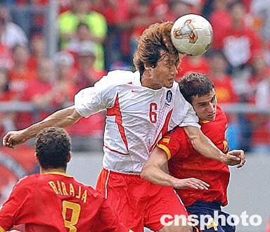 圖:西班牙VS韓國 柳相鐵飛身頂球 2002年06月22日 15:12 ![]() 6月22日韓日世界杯1/4決賽,西班牙隊(duì)VS韓國隊(duì)的比賽在韓國光州體育場(chǎng)進(jìn)行。目前場(chǎng)上比分為0:0。圖為韓國隊(duì)6號(hào)柳相鐵飛身頂球。