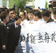 圖文:臺(tái)灣華航空難公祭 罹難者家屬抗議當(dāng)局無能 2002年06月22日 15:58 ![]() 罹難者家屬向阿扁表示抗議 聯(lián)合報(bào)/圖 中新網(wǎng)香港6月22日消息:臺(tái)北訊,臺(tái)灣當(dāng)局今天上午在臺(tái)北市為“五·二五”華航空難罹難者舉行聯(lián)合公祭。眾多罹難者家屬手舉“冤沉大海、還我命來”標(biāo)語,抗議當(dāng)局無能,并要求尋回每一具罹難者遺體。 據(jù)臺(tái)灣媒體報(bào)道,包括陳水扁、呂秀蓮等眾多島內(nèi)政壇人物在內(nèi),這場聯(lián)合公祭約有三千人參加,靈堂內(nèi)布有鮮花及225名罹難者的遺像,以及鐫刻罹難者姓名的石碑。 在靈堂正中央,設(shè)有一座名為“水火熱淚”的意像品。從失事現(xiàn)場取來的海水被注入“水火熱淚”中后,其中的火炬再被點(diǎn)燃,象征罹難者的精神與魂魄永遠(yuǎn)與親人同在。 據(jù)報(bào)道,當(dāng)陳水扁步入會(huì)場時(shí),傷心欲絕的罹難者家屬手舉白布條,一字排開,高喊著“不要敷衍我們、一定要找出真相”,有人邊流淚邊訴說,失蹤20多天的父親至今還不知下落,仍然被壓在海底。陳水扁稱“搜救沒有時(shí)間表”。 另外,不少罹難者家屬認(rèn)為,今天這場公祭只是一場虛情假意的惡心秀場。 罹難者陳杰人的胞兄難過地表示,這個(gè)星期三夜里,他夢見了全身濕透的弟弟,在冰冷的海中載浮載沉,痛苦地向他喊著“哥哥,救命、救命”,當(dāng)他驚醒后,就再也無法入眠。 抗議的白布條上寫著“公祭咒我必死、救命救命、等了很久、我要回家、趕快來接我”等字句,陳家無奈地指出,打撈工作進(jìn)度實(shí)在太慢,這對(duì)家屬相當(dāng)不公平,目前還有60多位罹難者仍在深海中沉蕩,今日的聯(lián)合公祭“盛會(huì)”,是否宣告著政府與華航責(zé)任已了? 陳杰人的胞兄說,主事者的無作為,讓打撈工作空轉(zhuǎn)了20多天,直到受難者靈肉支離破碎的時(shí)刻,才找來確實(shí)有能力的新加坡打撈公司,今天公祭意義何在?只不過是一場虛情假意的惡心秀場。 華航一架波音747-200客機(jī)5月25日在臺(tái)灣海峽澎湖上空解體成4大塊,墜入海中,機(jī)上乘客及機(jī)組人員全部罹難。目前已找到了158具尸體,還有67具死難者的遺體還未找到。