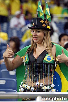 圖:巴西女球迷 2002年06月27日 16:49 ![]() 世界杯足球賽半決賽巴西隊對土耳其隊的比賽二十六日晚在日本琦玉縣世界杯體育場舉行,巴西隊以一比零取勝而進(jìn)入決賽。圖為現(xiàn)場助威的巴西球迷。作者:毛建軍