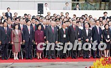 圖文特寫:迎接“大日子” 天空為香港升旗放晴 2002年07月01日 10:45 ![]() ![]() 香港舉行升旗儀式慶祝回歸五周年。七月一日,香港金紫荊廣場舉行隆重的升旗儀式,慶祝特區(qū)政府成立五周年。中新社傳真 潘索菲 攝 中新社香港七月一日電(記者徐足之)喜看今日香港城中,正是五星紅旗和紫荊旗的天下!今天是香港特區(qū)成立五周年紀(jì)念日,也是第二屆特區(qū)政府宣誓就職日,香港用莊嚴(yán)的升旗儀式,迎接這個特別日子的到來。 早上八點整,香港會議展覽中心金紫荊廣場,升旗儀式在洪亮的國歌聲中進(jìn)入高潮,八百名嘉賓肅穆而立,目送中華人民共和國國旗和香港特別行政區(qū)區(qū)旗(紫荊旗)同時迎風(fēng)飄揚而起。站在最前排的特首董建華、全國政協(xié)副主席霍英東、中聯(lián)辦主任姜恩柱,放聲唱起了國歌。 今天早晨重復(fù)了五年前難忘的一幕:大雨如注。但天公作美,升旗前后四十分鐘內(nèi),天空放晴,升旗結(jié)束才十分鐘,大雨又自天而降。一位講英語的西方記者興奮地說,五年前的今天早晨,也是大雨傾盆,這是一個很有意思的巧合,給人留下深刻的印象。 升旗儀式由主持人廣播主持。董建華在升旗儀式后緊接著的新政府就職典禮上將宣誓就任第二任行政長官。所以,在升旗儀式過程中,董建華倍享尊榮,早上七時五十五分,主持人廣播“董建華進(jìn)場了”,八時零五分儀式完畢,主持人廣播“恭請董建華第一個離場”。全場嘉賓和中外媒體的記者兩次將期待的目光聚焦在董建華身上。 除了穿西服的嘉賓外,香港各區(qū)民政事務(wù)局組織的市民,構(gòu)成升旗儀式上一道美麗的風(fēng)景:他們穿特制的慶回歸五周年T恤,手上搖著的是繪有香港標(biāo)志的小圓扇,握著的是書頁大小的國旗和香港區(qū)旗,兒童和青年人領(lǐng)囗下別著國旗和區(qū)旗的連體徽章。 站在最前面的市民,微笑著地回答一長排記者的提問,有的答為了準(zhǔn)備看今天的升旗儀式,早晨四點多就起床了;有的答之所以要搶在最前面的位置,要在升旗儀式上看看。 今天是香港的公眾假日,大部分市民在家中收看直播實況,香港無線電視、亞洲電視、有線電視、香港電臺和商業(yè)電臺都對升旗儀式做了現(xiàn)場直播。一些市民大早走上街頭,在香港著名的海運大廈和時代廣場的戶外電視屏幕上觀看直播。