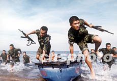 圖:解放軍沖鋒舟武裝搶灘登陸演習(xí) 2002年08月03日 17:28 ![]() 沈陽(yáng)軍區(qū)官兵今夏在東北某海域進(jìn)行水上多項(xiàng)軍事課目訓(xùn)練,演習(xí)武裝搶灘登陸,向既定目標(biāo)快速挺進(jìn)。作者:馬檣