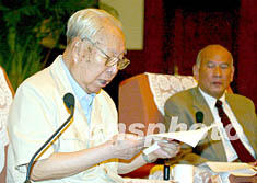 ![]() 黃埔軍校同學(xué)會(huì)在京理事九日舉行座談會(huì),譴責(zé)陳水扁的“臺(tái)獨(dú)”言論。圖為黃埔軍校同學(xué)會(huì)宣傳委員、周恩來(lái)總理的侄女周秉德在會(huì)上發(fā)言。毛建軍 攝