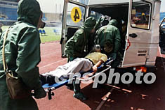 圖為武警總隊(duì)處置生化恐怖襲擊緊急救護(hù)