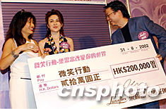 為改變中國病童的世界,好讓他們重現(xiàn)笑容,香港樂思富公司8月31日在時代廣場捐贈價值20萬港元產(chǎn)品支持 “微笑行動”慈善機構(gòu)。圖為樂思富公司總經(jīng)理羅宜敏【右】將支票頒給“微笑行動”代表接收。洪少葵 攝