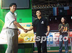 中國著名跳水運動員、二000年悉尼奧運會跳水冠軍田亮五日與安利(中國)日用品有限公司簽約,成為安利紐崔萊代言人。圖為簽字儀式上,安利大中華區(qū)副總裁顏志榮(右三)與田亮握手致意。作者:潘旭臨