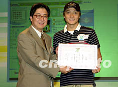 歌星方力申9月5日出席香港電臺聯(lián)同教育署舉行「教育電視2002-2003新學(xué)年啟播典禮」。助理廣播處長張文新向方力申致送邀請狀,邀請他參與演出教育電視節(jié)目。鄧慶樂 攝