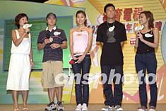 四位樂壇年青歌手方力申、李彩樺、余文樂、方皓玟(左二起)9月5日出席香港電臺聯(lián)同教育署舉行的「教育電視2002-2003新學(xué)年啟播典禮」。他們將有機會參與演出教育電視節(jié)目,教育電視節(jié)目將于9月9日起正式啟播。鄧慶樂 攝