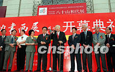 為慶祝北京師范大學(xué)百年校慶,“啟功書畫展”六日在中國革命博物館舉辦。啟功先生(左六)、前人大常委會委員長喬石(左五)和中央統(tǒng)戰(zhàn)部部長王兆國(右四)參加了開幕式。作者:張勤