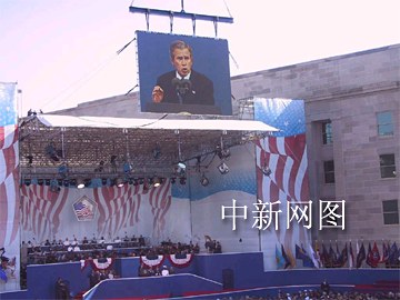 今天的儀式在去年被客機(jī)撞毀的五角大樓西側(cè)舉行,這里如今已重建并裝飾一新。上午九時(shí)三十分,美國(guó)軍樂隊(duì)奏響了紀(jì)念序曲。九時(shí)三十七分-去年飛機(jī)撞擊五角大樓的時(shí)刻,全場(chǎng)默哀。美國(guó)國(guó)旗從五角大樓頂部舒卷而下,布什帶領(lǐng)一百名兒童宣誓。