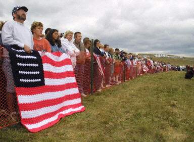 在匹茨堡東南70英里的阿帕拉奇安高低的這片露天礦上,聚集了數(shù)千名民眾,包括500多名遇難者的家屬。他們很多人飽含熱淚,在陰沉的天空下緊握著美國國旗。當(dāng)?shù)貢r(shí)間上午10:00,正是一年前那架波音757客機(jī)以大約500英里的時(shí)速墜毀在這片空地上。當(dāng)被美國總統(tǒng)布什譽(yù)為英雄的33名遇難乘客和7名殉職的機(jī)組人員名單被宣讀時(shí),一座百年歷史的教會(huì)鐘悠然響起。