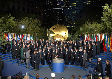 罹難者人數(shù)最多的紐約世貿(mào)廢墟是今天全美紀(jì)念活動的中心,數(shù)以萬計的人今天早晨聚集在這里聆聽每一位罹難者的名字,沿著長長的斜坡走進(jìn)七層樓深的世貿(mào)廢墟中為他們獻(xiàn)花。當(dāng)暮色降臨的時候,距離世貿(mào)廢墟不遠(yuǎn)的炮臺公園點燃了一簇火焰,聯(lián)合國秘書長安南、美國國務(wù)卿鮑威爾、紐約市長布隆博格以及中國外長唐家璇等來自罹難者家鄉(xiāng)的代表一起舉起點燃的蠟燭,悼念死難者。與此同時,紐約的五個行政區(qū)的公園里也聚集了眾多的市民,搖曳的燭光寄托著對逝者的思念。