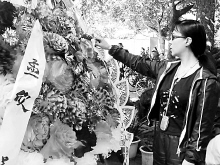 進(jìn)入高楓靈堂的人群排成一條長(zhǎng)龍,肅穆的靈堂中沒(méi)有哀樂(lè),自始至終回響著高楓生前的歌曲。一對(duì)手捧菊花50多歲的老歌迷,聽(tīng)到歌聲不禁潸然淚下,“這是高楓的《雨》,他走的那天剛好下著雨,他的歌很感人,是個(gè)好孩子呀!痹谒麄兩砗蟮幕ㄈι虾杖粚(xiě)著“愿歌聲回響天堂”。(金力維)